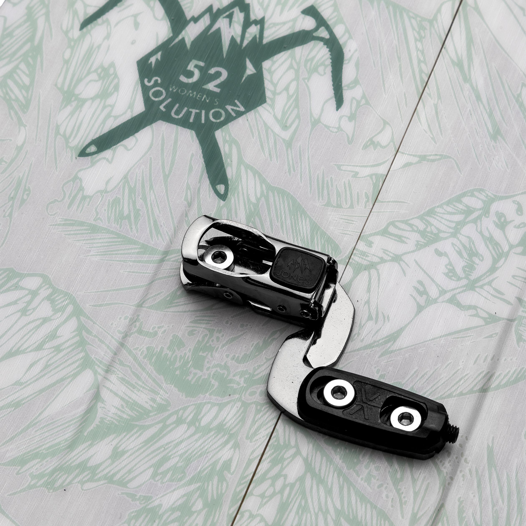 Das Jones Women's Solution enthält einen Ultra Split Core, der natürliche Leichtigkeit mit verstärkter Stabilität kombiniert. Das Triax-Glas ermöglicht kontrollierte Querdehnbarkeit. Die BComp Carbon Flax Stringer verstärken das Board, ohne es zu beschweren. Die Flip-Flop 8000-Oberseite und die biobasierte Harz erhöhen die Langlebigkeit und senken gleichzeitig die Umweltbelastung. Die Kanten aus recyceltem Stahl und die sorgfältig bearbeiteten Kanten sorgen für einen prägnanten Halt unter alpinen Bedingungen.