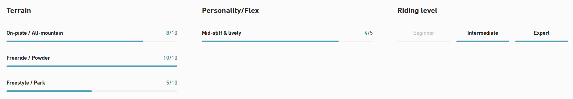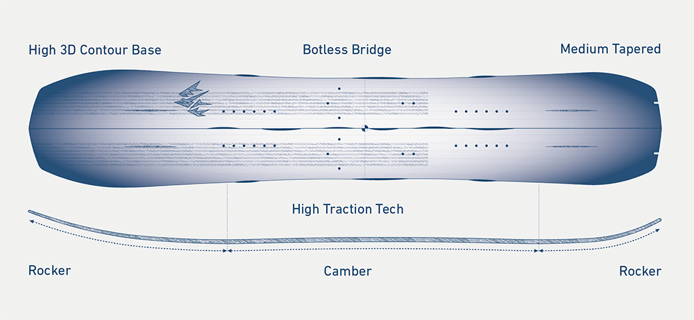 - Camber/Rocker-Profil: ein Camber unter den Füßen für Halt und Rocker in der Spitze für Auftrieb.