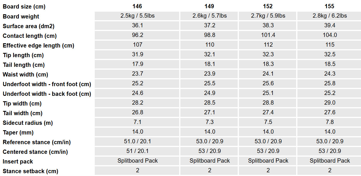 Für eine gute Balance zwischen Aufstieg und Abfahrt empfiehlt es sich, eine Größe nahe der eigenen Klassiker-Board-Größe zu wählen. Stellen Sie den Stance auf die empfohlene Breite ein und verwenden Sie die passenden Felle. Der Setback von 2 cm optimiert den Auftrieb im Tiefschnee, ohne die Wendigkeit auf hartem Schnee einzuschränken.