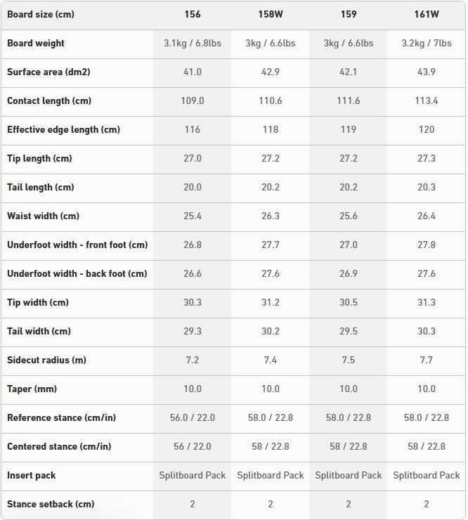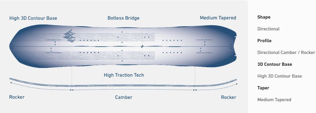 - Profil Directional Camber / Rocker: sorgt für sicheren Grip auf harten Terrain und verbessert die Flotation im Powder.