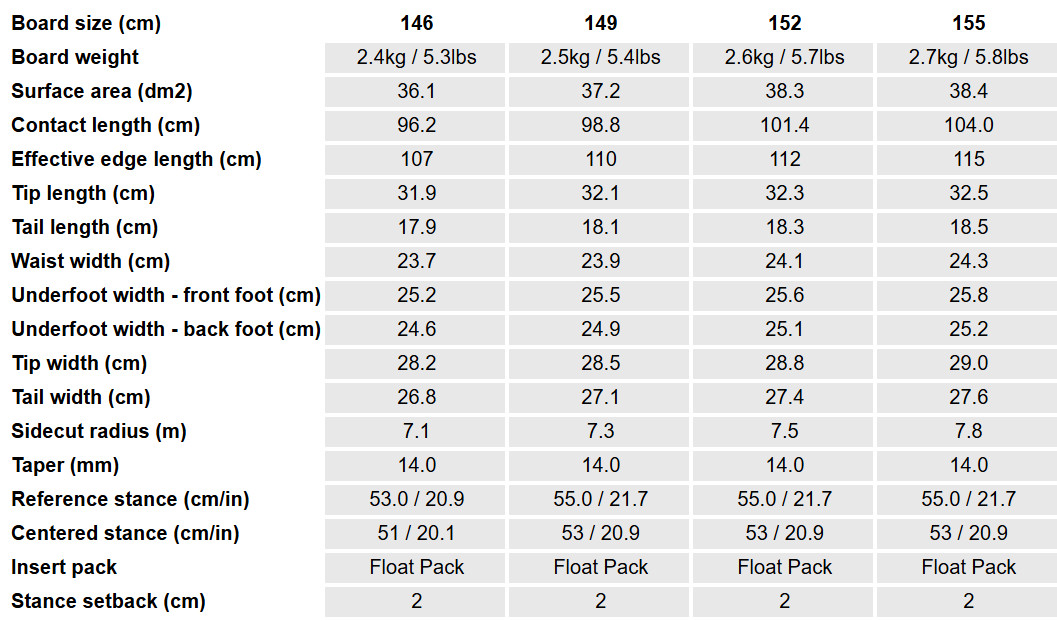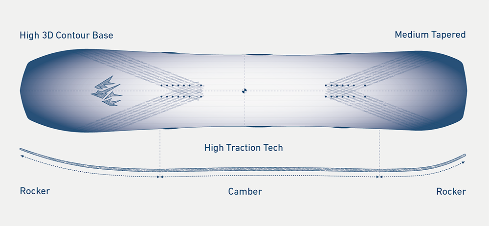 - Directional Shape: verbessert das Fahrverhalten im Pulverschnee und verstärkt den Auftrieb an der Front des Boards.