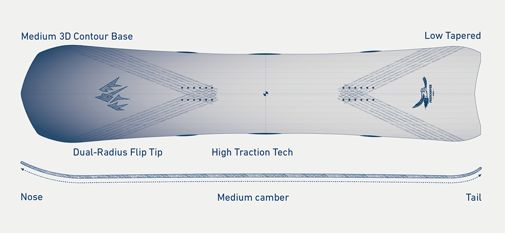 Ein Directional Snowboard, das entwickelt wurde, um klare Kurven zu ziehen und jedes Gewicht mit Präzision auf jedem Schneetyp zu spüren.