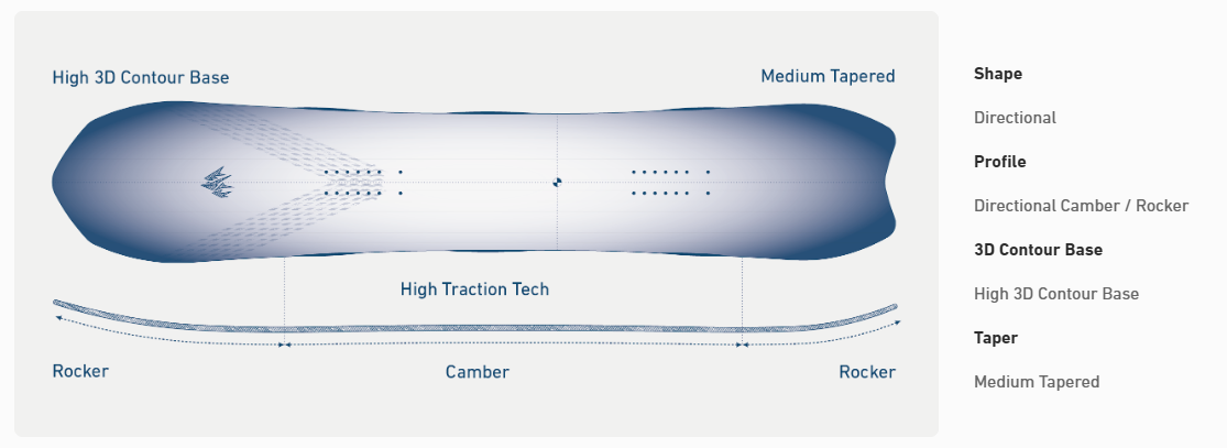 - Directional Camber/Rocker-Profil: Fördert den Grip unter den Füßen und erleichtert den Übergang auf unterschiedlichem Schnee.