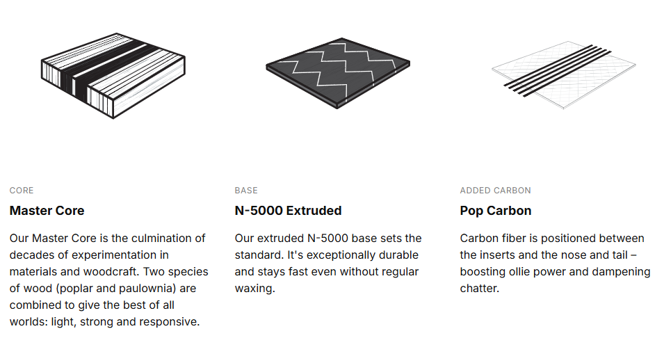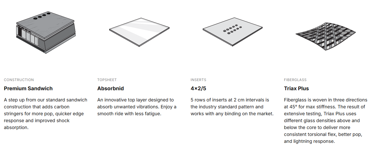 - Master Core: Mischung aus steifem und leichtem Holz für ein ausgeglichenes Fahrverhalten zwischen Wendigkeit und Stabilität.
