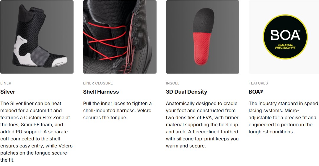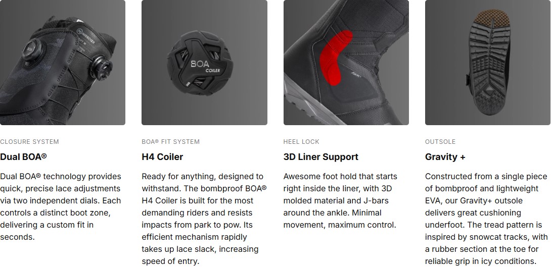 Das Dual BOA®-System sorgt für eine schnelle Anpassung mit zwei unabhängigen Zonen. Der thermoformbare Silver Liner verbessert den Innenhalt und reduziert Druckstellen. Die Gravity+-Sohle aus EVA und Gummi dämpft Stöße und sichert den Halt. Der External Heel Lock fügt eine externe Verstärkung hinzu, um die Ferse zu stabilisieren, ohne die natürlichen Bewegungen einzuschränken.