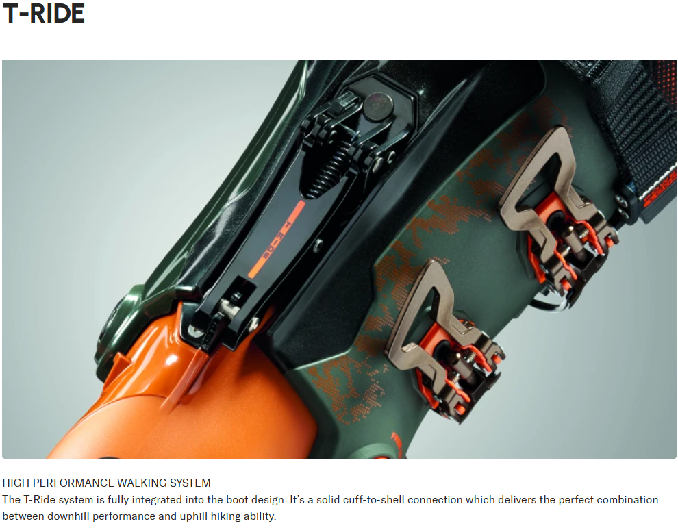 - T-Ride-System: erhöht den Bewegungsbereich beim Gehen, ohne Präzision im Skimodus zu verlieren.