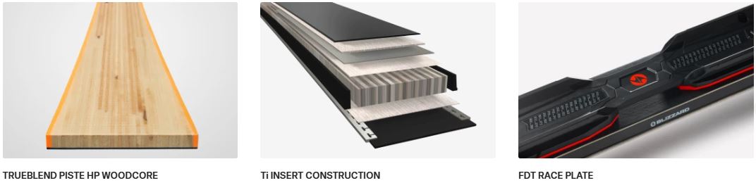 Die Sandwich TI-Bauweise integriert ein Titanal-Verstärkung über die gesamte Länge des Skis für mehr Stabilität und direkte Kraftübertragung. Der Trueblend Piste-Holzkern kombiniert verschiedene Holzarten mit unterschiedlichen Dichten für einen kontrollierten Flex je nach Ski-Zone. Die FDT Race Plate B verbessert die Effizienz der Kraftübertragung zwischen Ski und Bindung und minimiert Energieverluste. Zusätzlich sorgt der Voll-ABS-Stein für optimalen Kontakt zwischen Ski und Schnee über die gesamte Kante.
