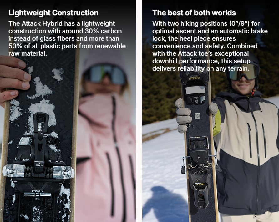 - Interchangeable hybrid system: combines a classic alpine toe and a pin toe to alternate between ascent and descent.