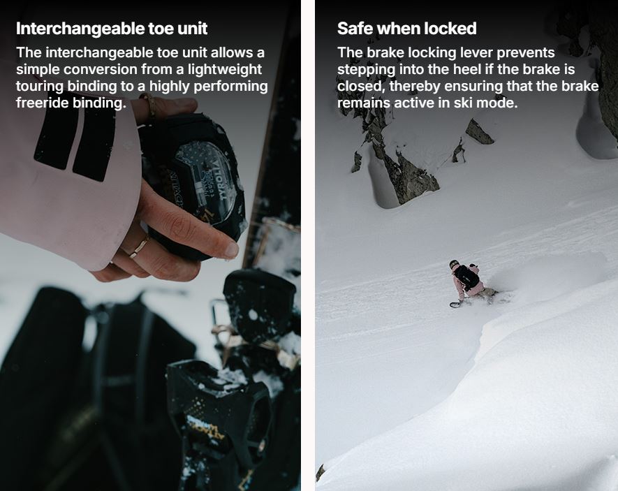 A versatile binding for off-piste skiing as well as approaches. Designed to combine safety, engagement, and comfort.