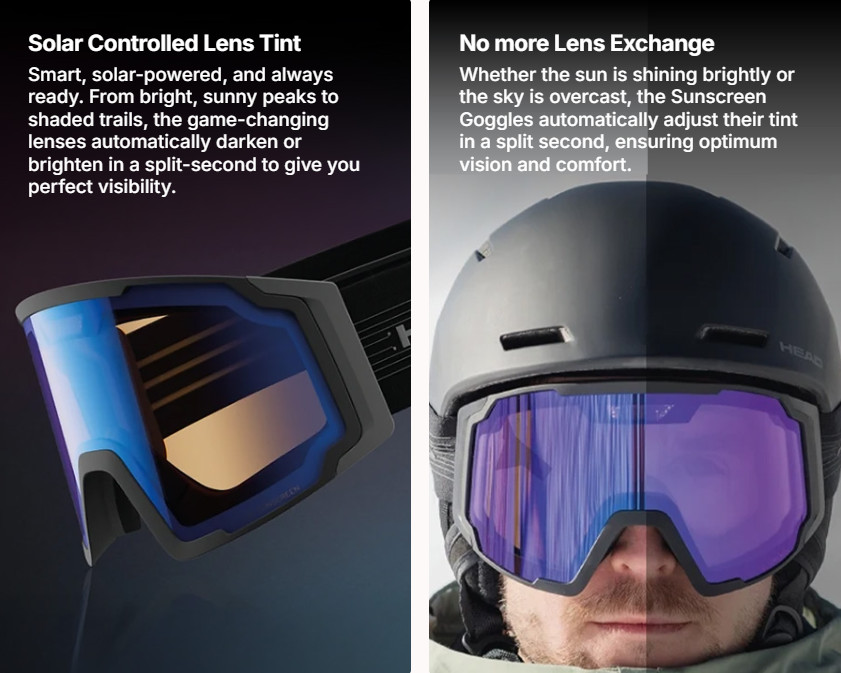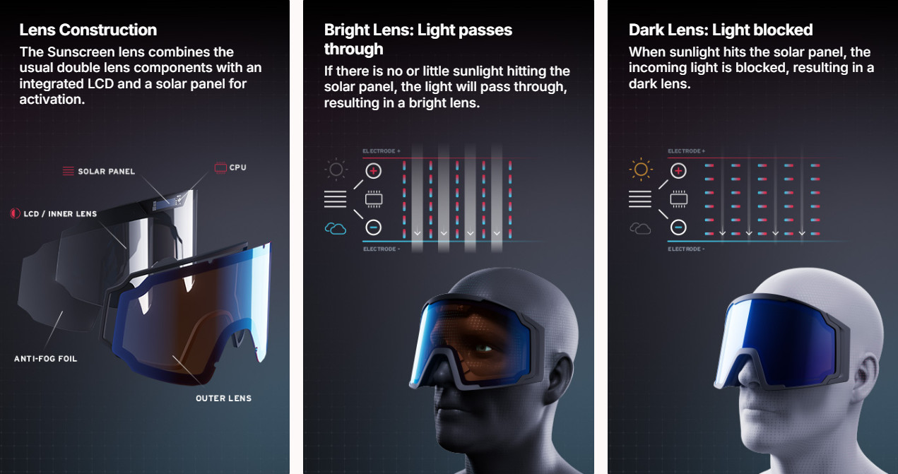 The Sunscreen LCD self-tinting technology adjusts the lens tint according to ambient light in a fraction of a second. This system is entirely powered by solar energy captured directly on the goggles, ensuring autonomy and consistent performance without an external power source.