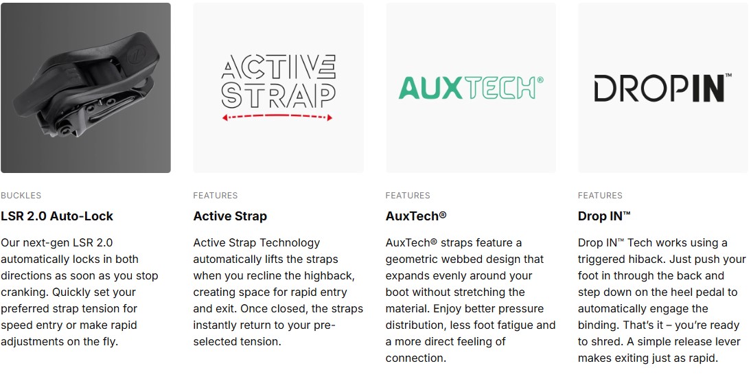 The Supermatic technology enables smooth automatic rear entry without opening the straps. The straps incorporate AuxTech, an expandable grid pattern that distributes pressure and follows the foot's movements. The Drop IN chassis made from reinforced nylon composite optimizes pressure transfer while absorbing vibrations. The LSR 2.0 Auto-Lock buckles automatically lock without effort. The inclined BankBeds footbed enhances comfort and promotes natural lower body alignment.