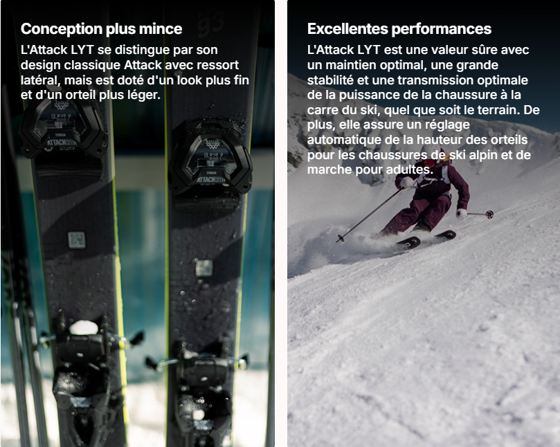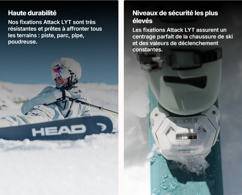 • Poids 905 g par fixation : limite l’encombrement sur les rotations et améliore les sensations à ski.