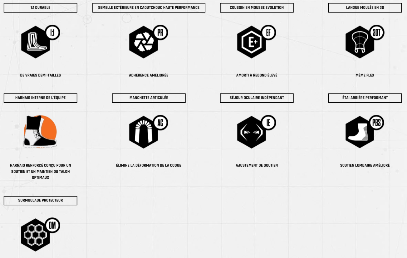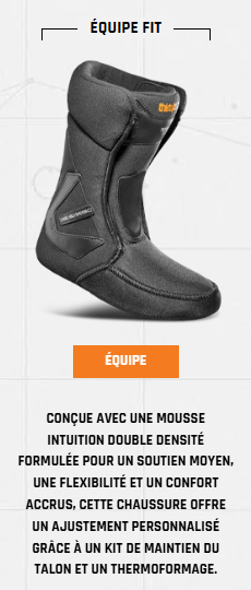 - Chausson Team Fit Intuition Foam : structure double densité 100 % thermoformable pour un ajustement évolutif pleine journée.