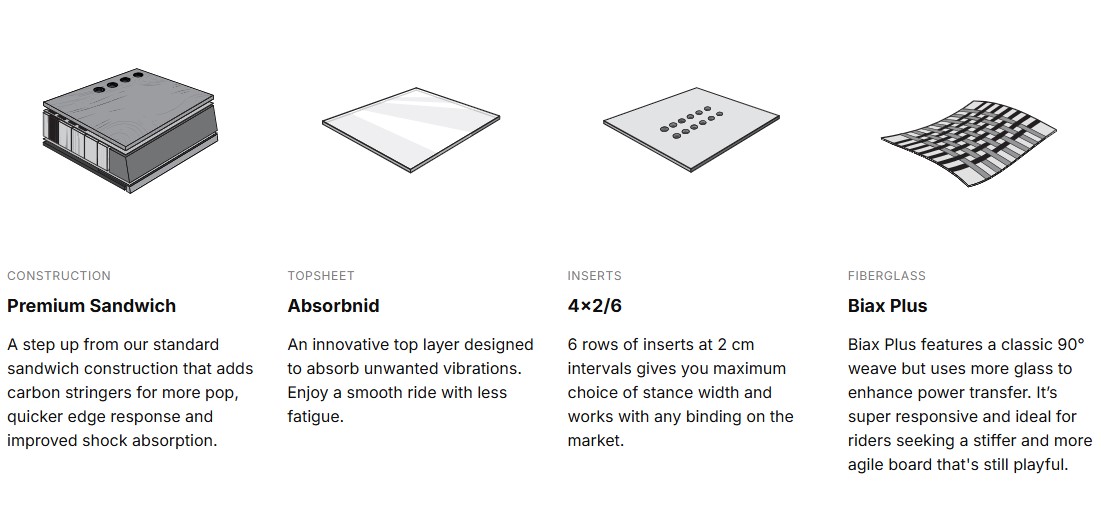 • Topsheet Absorbnid : filtre les vibrations pour un meilleur confort sur les neiges dures ou trafolées.