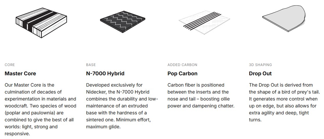 La construction Premium Sandwich du Snowboard Nidecker Alpha 2026 combine des renforts carbone et un laminage Biax Plus Fiberglass pour offrir une réactivité accrue et un meilleur transfert d’énergie. Son noyau Master Core, mélange de paulownia et peuplier, optimise le rapport poids/solidité. La semelle N-7000 Hybrid, frittée haute performance, maximise la vitesse. Le topsheet Absorbnid réduit les vibrations pour un ride plus fluide et contrôlé, même sur neige dure.